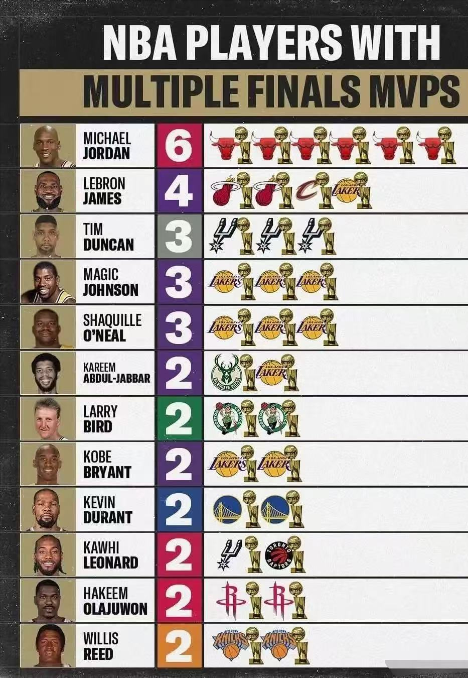NBA历史上漫漫长河,一个人拿下至少2个FMVP的,却一共只有12个人。今天笔者就来盘点一下,这12位神人,以及他们与FMVP之间的的故事。拿2个FMVP有多难?历史仅12人做到,老詹独一份,库里被“抢劫”!
